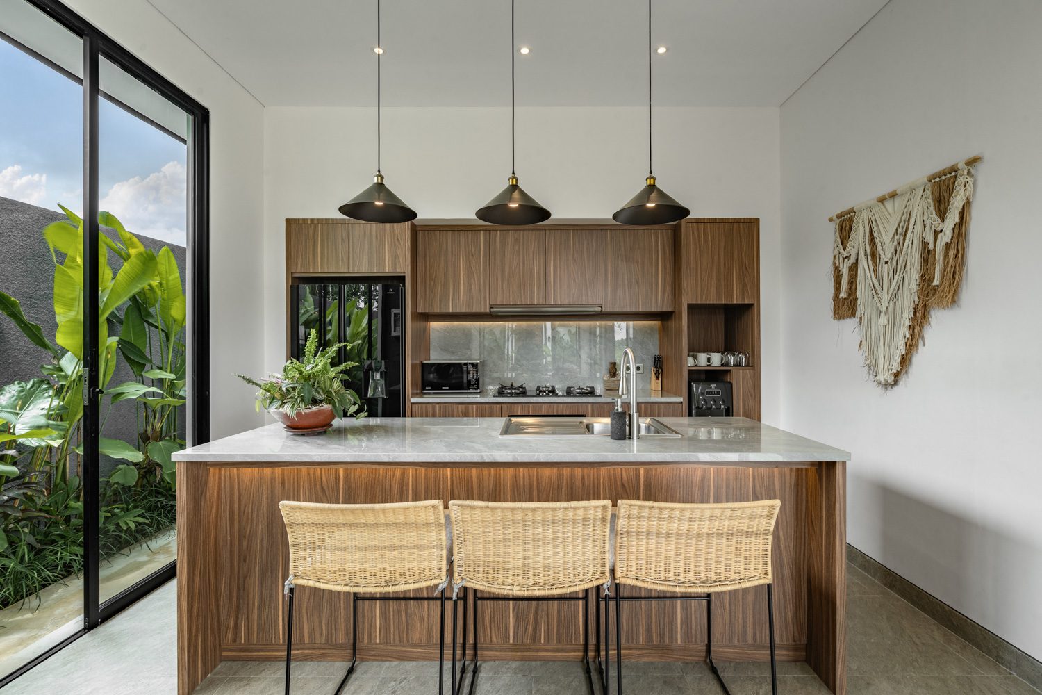 Villa Crescence Paradise’ open-plan living area blends modern comforts with cozy touches. A fully equipped kitchen and stylish dining space overlook a vertical garden, while the inviting lounge area, complemented by ceiling fans, is perfect for unwinding.