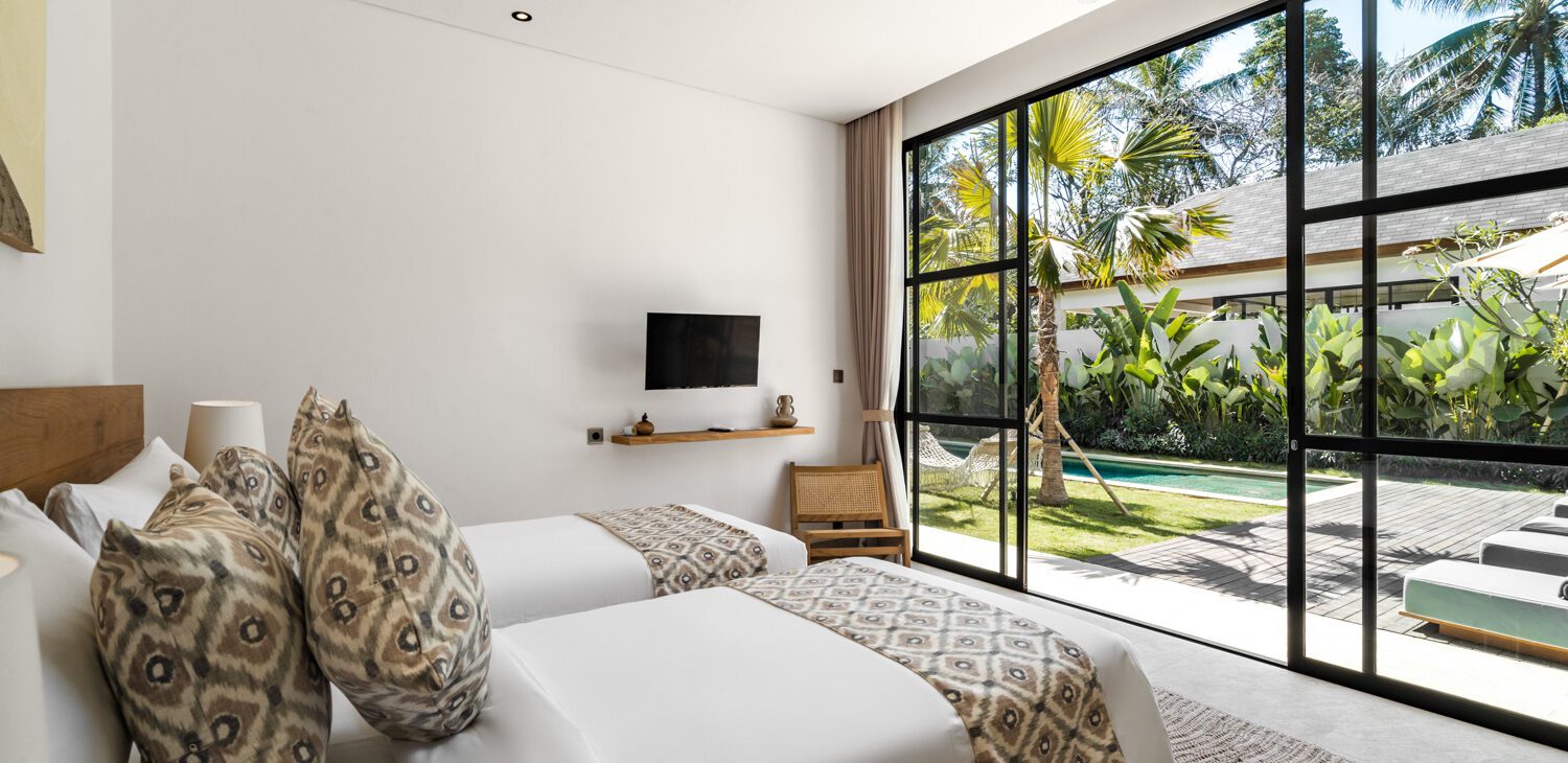 The villa has three beautifully appointed bedrooms, each with a queen-size bed. For added flexibility, one of the queen-size beds can be converted into twin beds to suit the preferences of our guests. One bedroom comes with a mosquito net for added comfort, and the third boasts an outdoor bathtub.