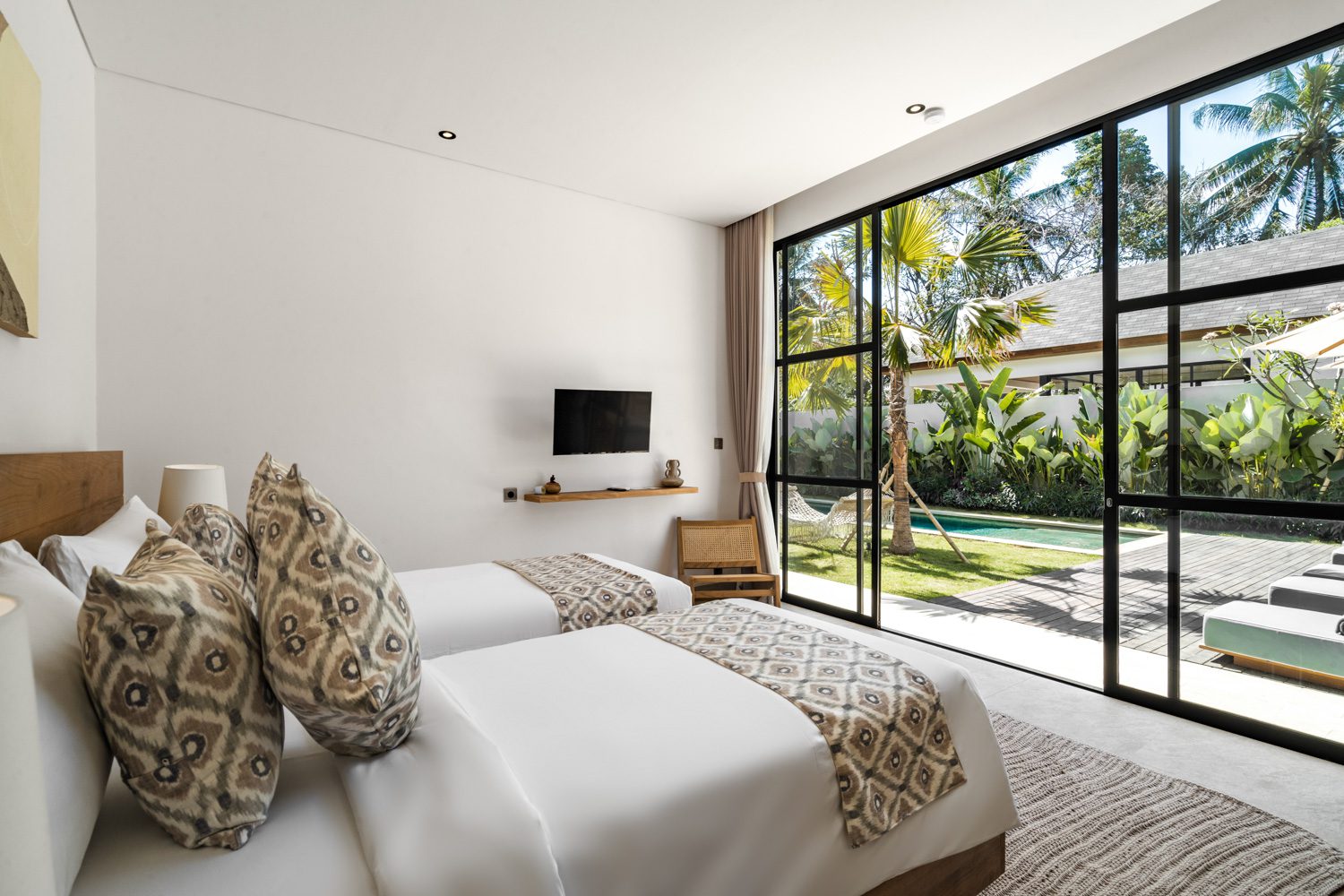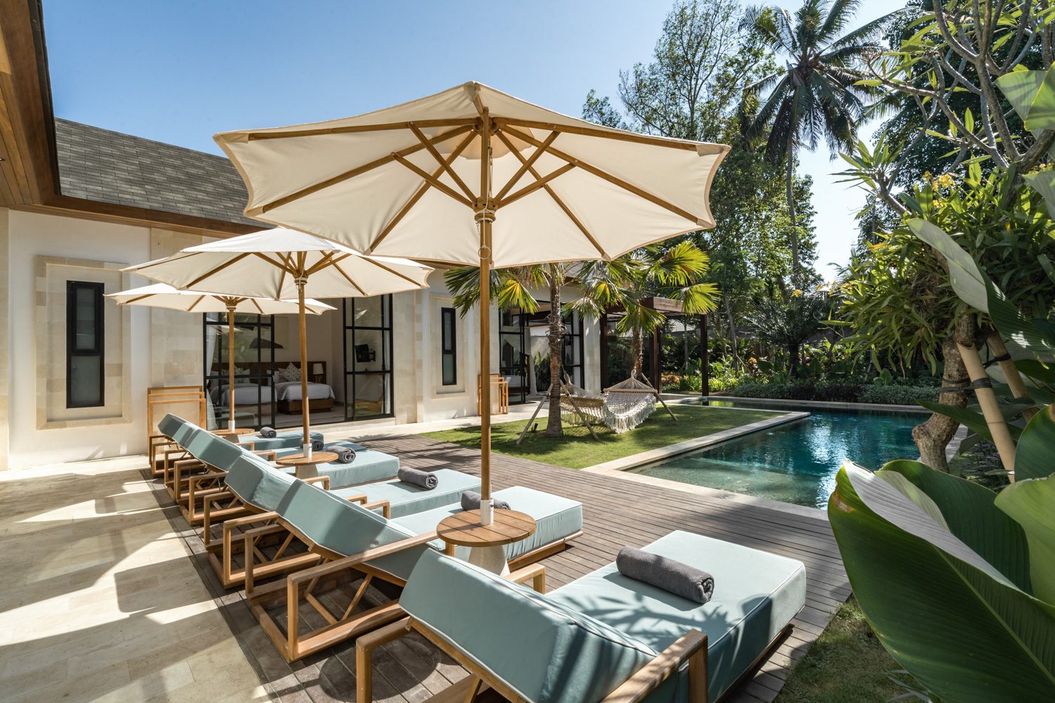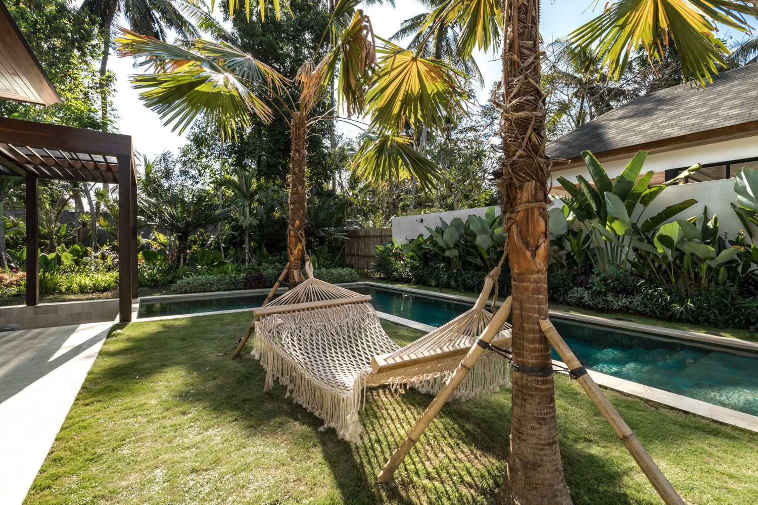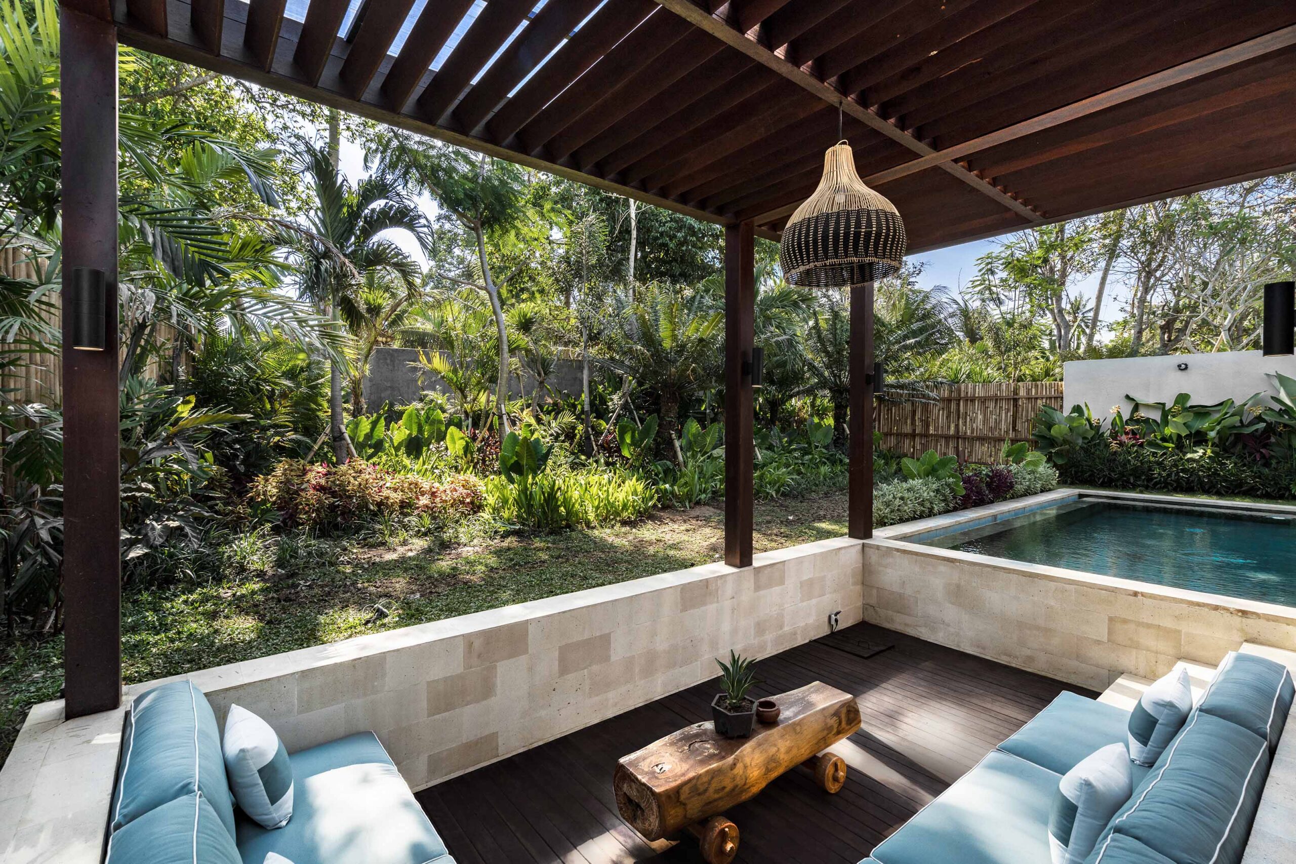 Stepping outside, guests can enjoy the outdoor sofa beneath a pergola, providing a comfortable spot to relax or entertain. The sunbeds by the villa offer a peaceful spot to soak up the sun and take in the surrounding greenery. An outdoor shower is available for refreshing rinses after a swim, adding to the tropical experience.