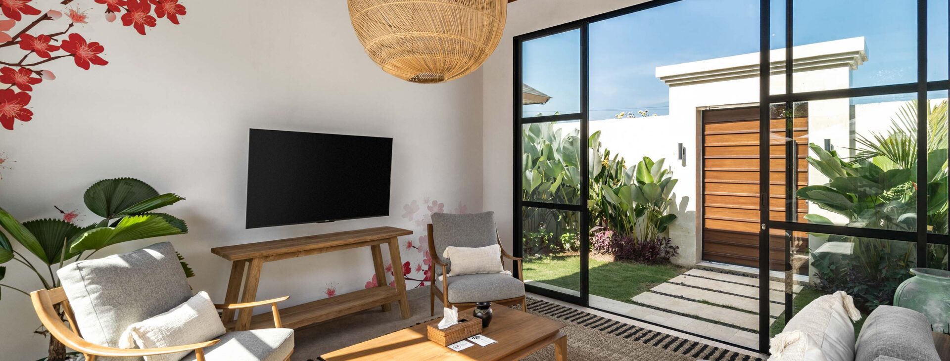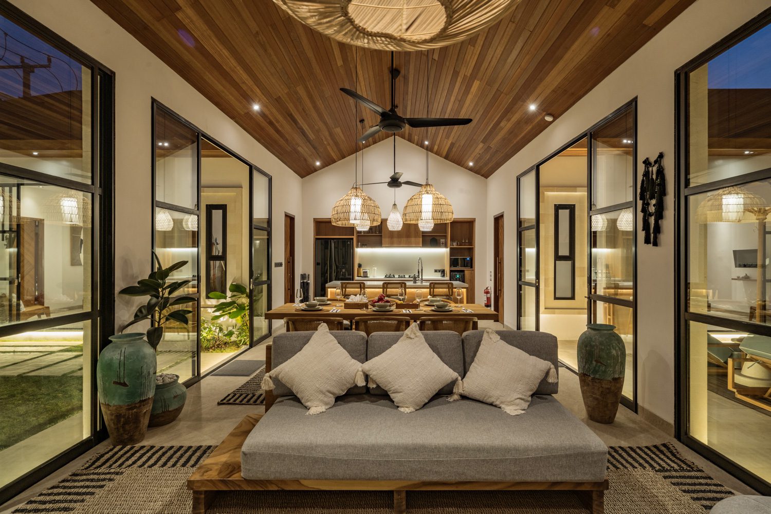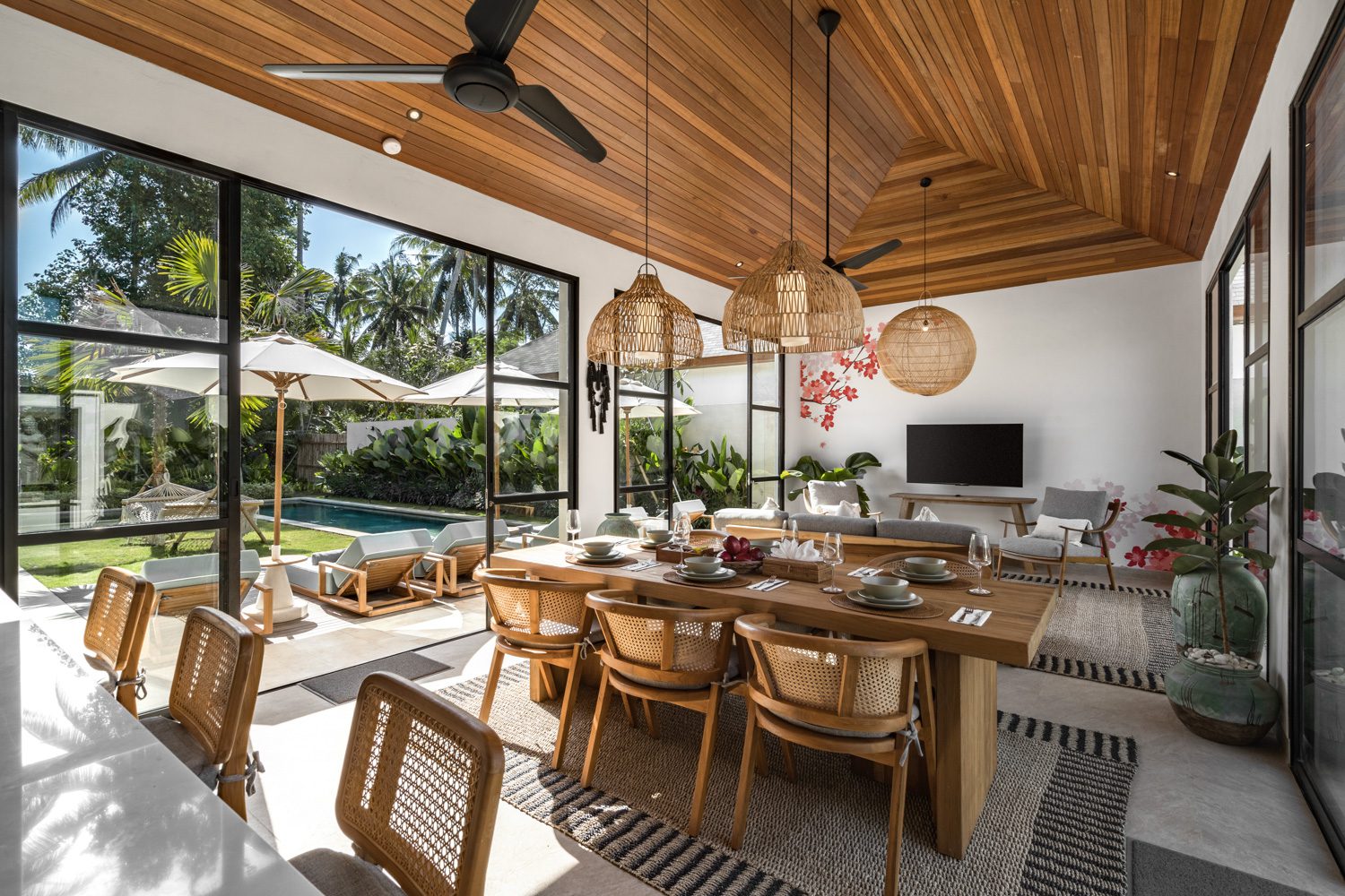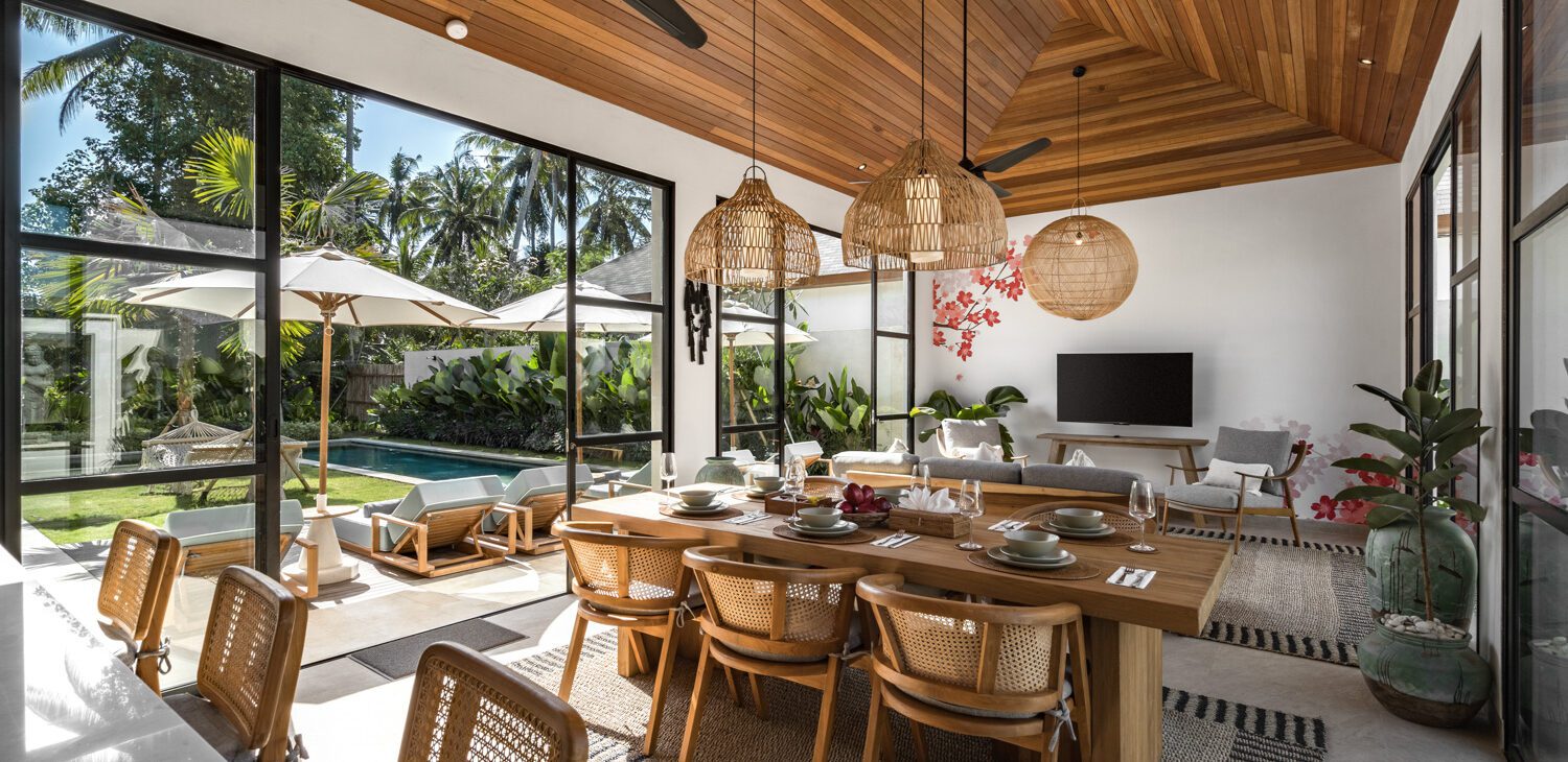 The center of the villa is the bright, semi-open living area, flooded with natural light thanks to its surrounding glass walls. The space is furnished with a cozy sofa and a Smart TV. The living room flows seamlessly into the dining area and fully equipped kitchen, creating a spacious hub where guests can gather. Two ceiling fans help keep the area cool and inviting.