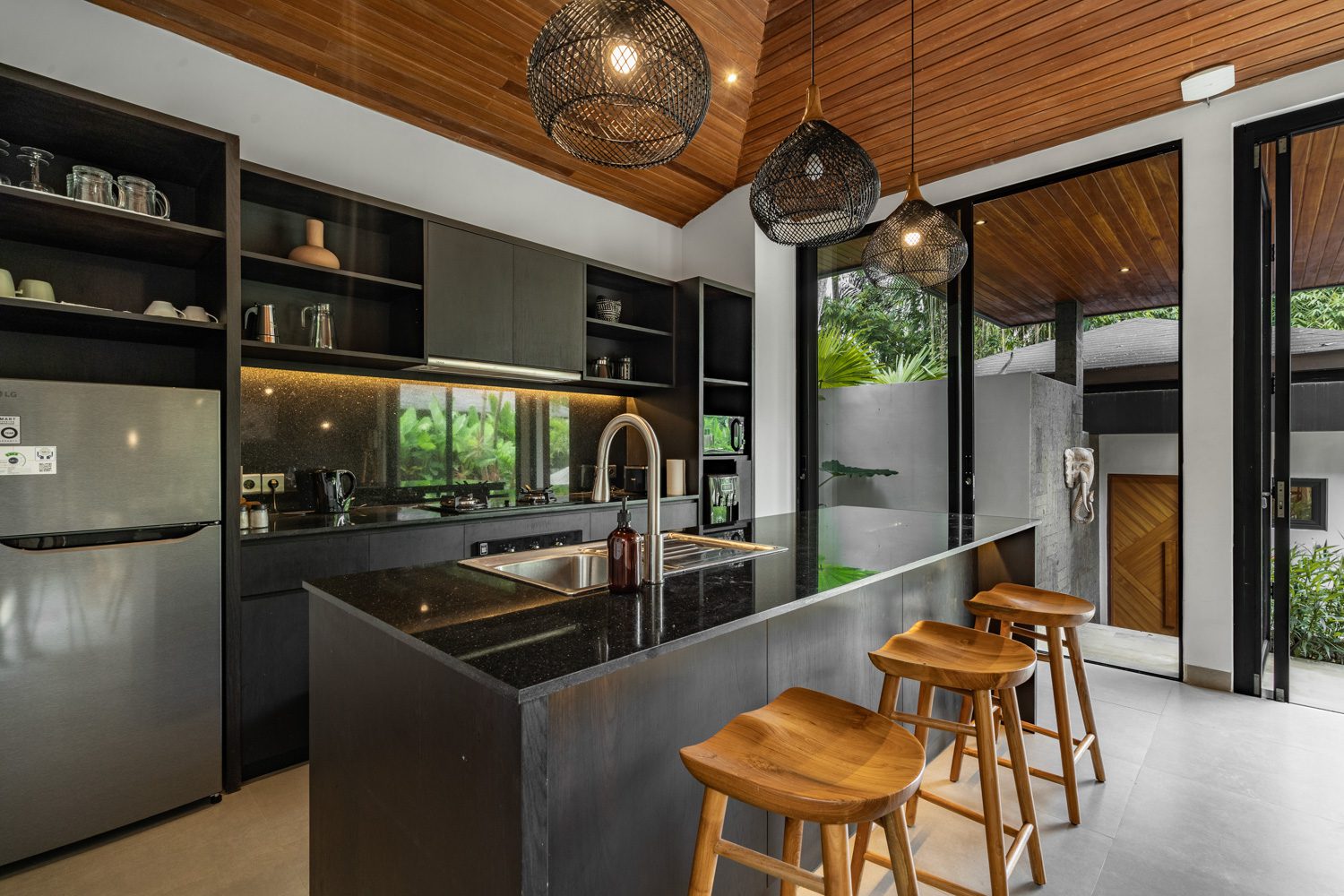 The heart of Villa Kemalasan lies in its inviting living area, where a cozy sofa and breathtaking jungle views create the ideal space for unwinding. The fully equipped kitchen enhances the convenience of your stay, while ceiling fans ensure a refreshing atmosphere. A guest toilet adds to the overall comfort of the villa, ensuring a seamless experience throughout your visit.