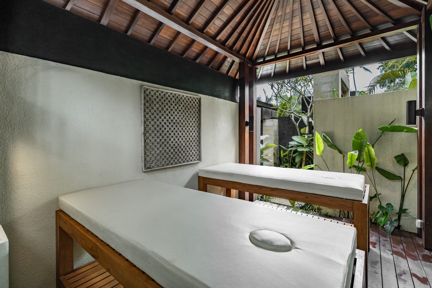 A charming gazebo offers a unique Balinese touch, ideal for soaking in the tranquil jungle views. For ultimate relaxation, enjoy a soothing massage session on the outdoor massage beds.