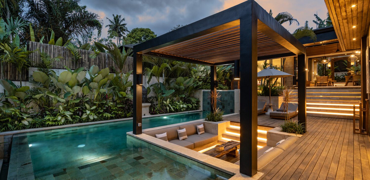 Step outside to experience Villa Kemalasan’s serene outdoor spaces, where a sunken area beneath the pergola offers the perfect setting for conversations with friends or family. Relax in the refreshing blue pool with its whirlpool bath and enjoy the beauty of the Balinese sky as you lie back on the sun loungers, equipped with parasols for your comfort.